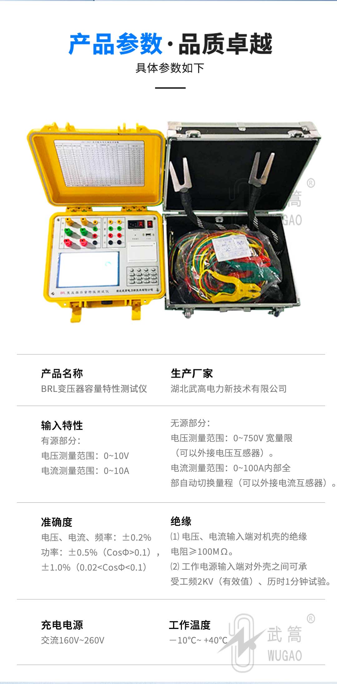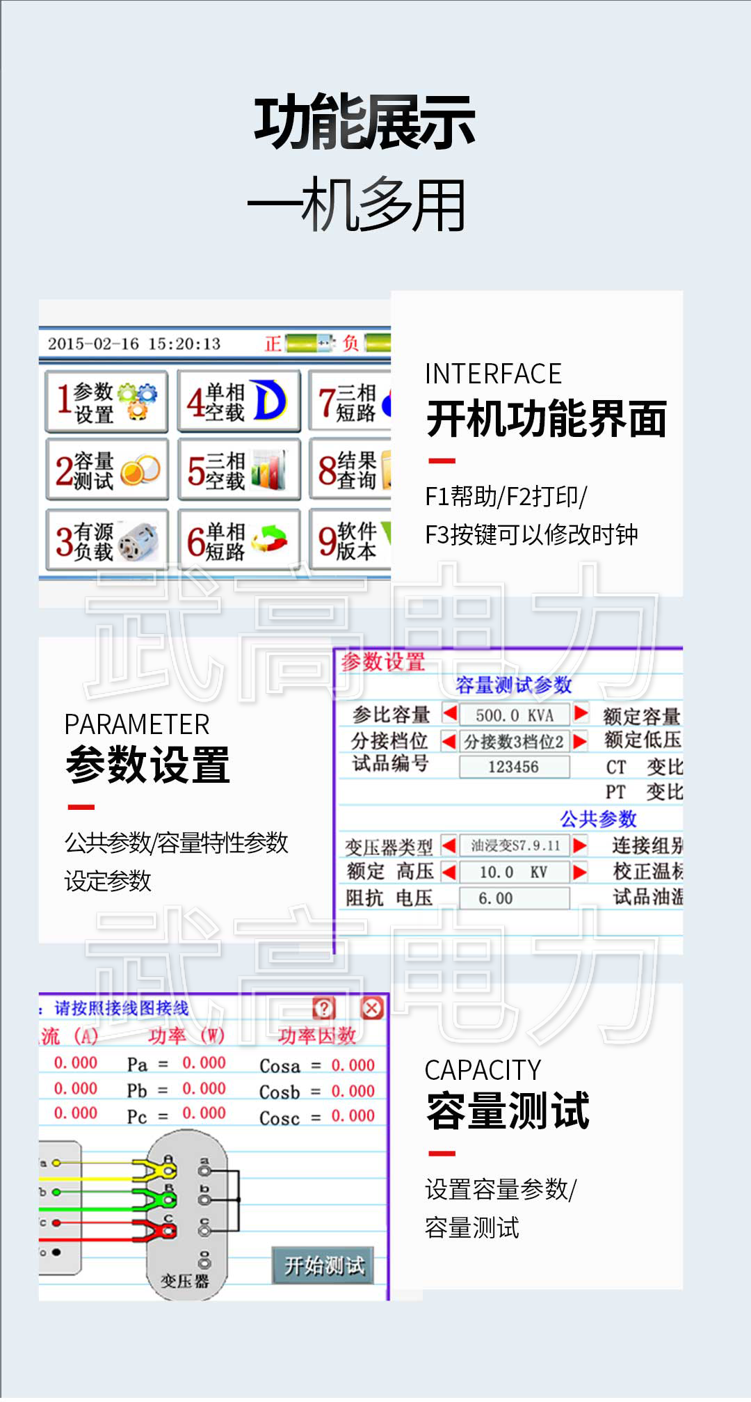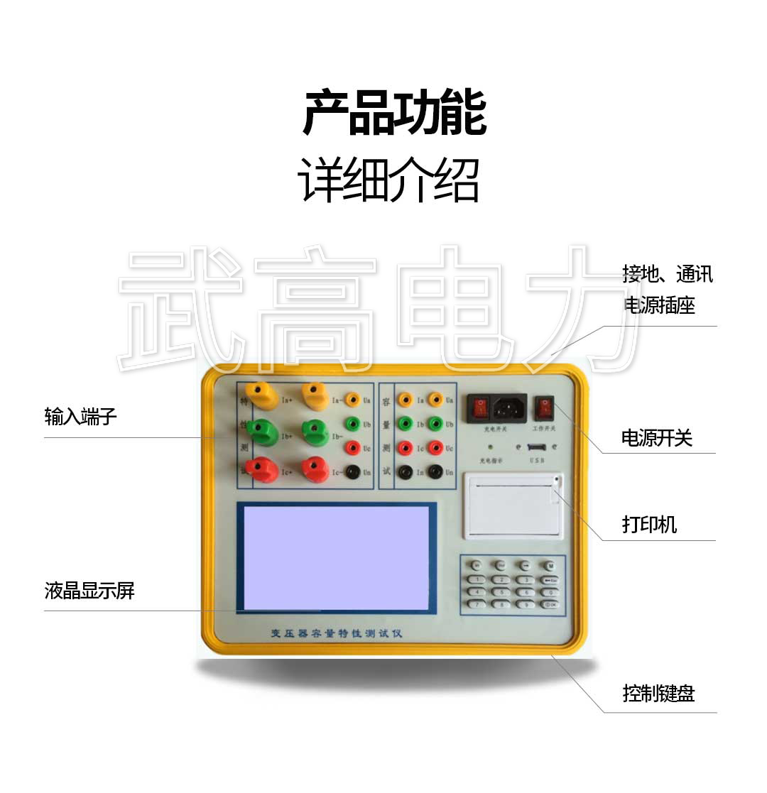 測量變壓器的容量、負(fù)載損耗、空載損耗、阻抗電壓、空載電流等工頻參數(shù)。